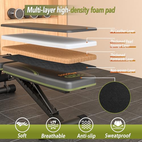 Highly Adjustable Bench: The adjustable workout bench offers 9 backrest positions, enabling versatile exercise such as incline, decline, flat and sit up bench. Gently move the angle of the backrest to quickly adjust to the position that works best for you