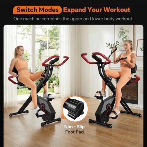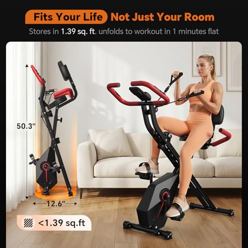 Foldable Exercise Bike – Stationary Bike for Home with 5.5 Pound Flywheel and Arm Resistance Bands, 300LB Capacity, 10dB Quiet, Heart Rate Monitor for Small Apartment Cardio