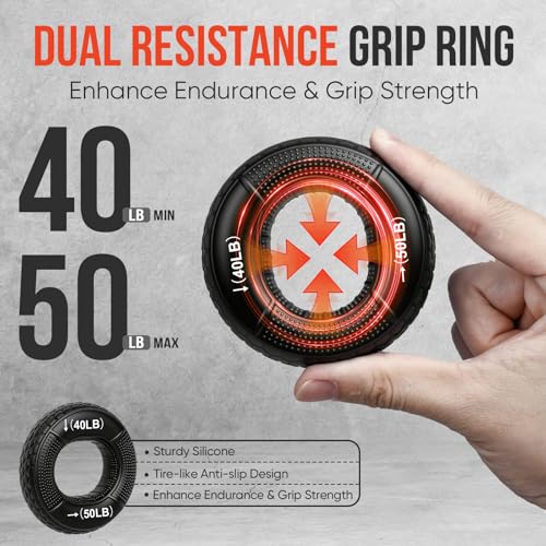 【MULTI-RESISTANCE FOR EVERY SKILL LEVEL】 Adjustable Forearm Strengthener: 22-220 lbs (10-100 kg) resistance dial (beginners to pros). Hand Grip Strengthener Ball: Textured, 20-40 lbs progressive squeeze for endurance. Grip Rings: 40-50LB resistance; food-grade silicone, non-slip, durable. Finger Stretcher: 8.8 LB; break-resistant bands, ergonomic fit for all-day use.